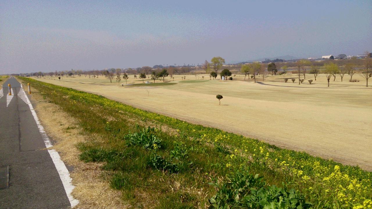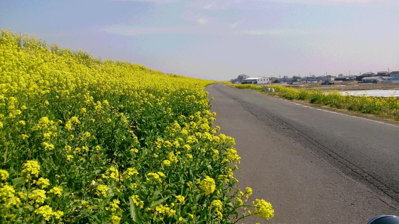 利根川の刀水橋を渡りグライダー練習場までの土手沿いの道です。4k程、切れ目なく菜の花が咲いています。土手の下はゴルフ場も有ります。